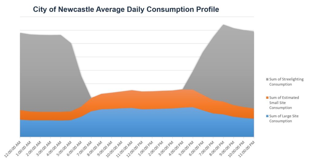 The renewable electricity contract has been sized to meet 100% of City of Newcastle (CN) electricity usage over the course of a year, including over 200 small sites. In application though, the generation is applied against load demand from large sites (C&I) and the Street lighting, with small sites (SME) treated separately for a number of reasons. Without going too much into detail, this structure also has the advantage of raising the supply/demand matching between the renewable generation and CN electricity usage.