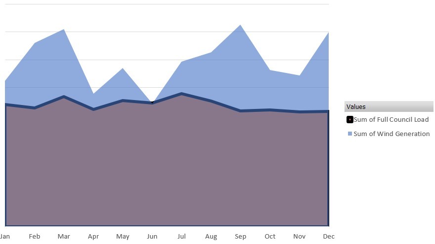 The graph above shows that electricity usage for buildings and facilities predominately occurs during the day. Through an ongoing program at CN of installing solar PV across sites, this daytime demand has been greatly reduced over time. The biggest single area of electricity usage however is street lighting, providing a strong case for alternative renewable energy generation other than Solar power. The best match for providing this high evening generation turned out to be Sapphire Wind Farm.