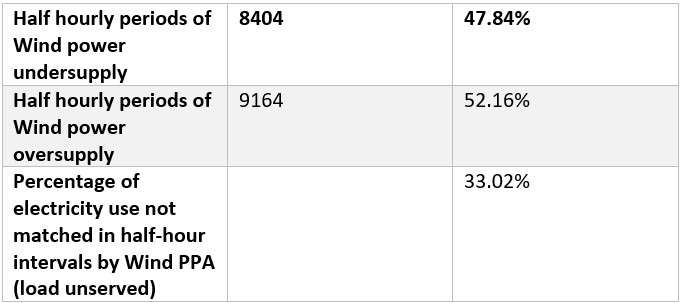 This shows that for more than two-thirds of all CN electricity supply, the windfarm was generating enough power to match this on a half-hourly basis, without requiring any firming. It is also worth noting that this is when comparing a single source of renewable supply. By sourcing renewable electricity from a range of different generators, in different geographic areas, this matching can easily be much higher and reducing the need for large amounts of firming such as battery storage.