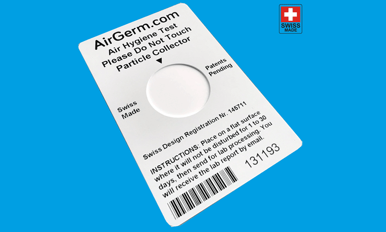 To use, a credit card sized sampler is placed on a flat surface such as a table, shelf or rack for 1 to 30 days and then sent to a laboratory with the post paid mailer. The air hygiene report shows bioaerosols in CFU/m3 and corresponds to the ISO 14644-1 standard. Additionally, the particle metrics report shows fibers, PM10, PM2.5 and particle size distribution. The AirGerm kit is available at: www.airgerm.com Email: contact@technologycare.com