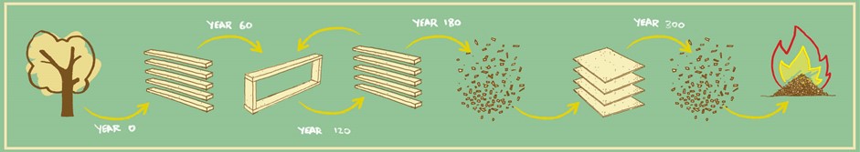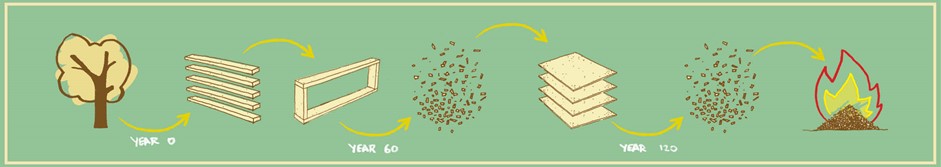 Of course, the joist won’t last forever, but adding a further two life cycles onto the original 60 years means that at 180 years old, it will become the feedstock for a board product. And maybe after two lifecycles as a board product, it becomes biomass fuel. Its life in the reuse economy ends at 300 years, 180 years longer than the recycling alternative.