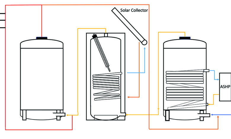 Example three-cylinder arrangement to meet NHS HTM. The heat pump and solar use a dual coil cylinder with the heat pump on the bottom and the solar on top. With this arrangement, there is no thermal conflict between the heat pump and solar adds what it can.