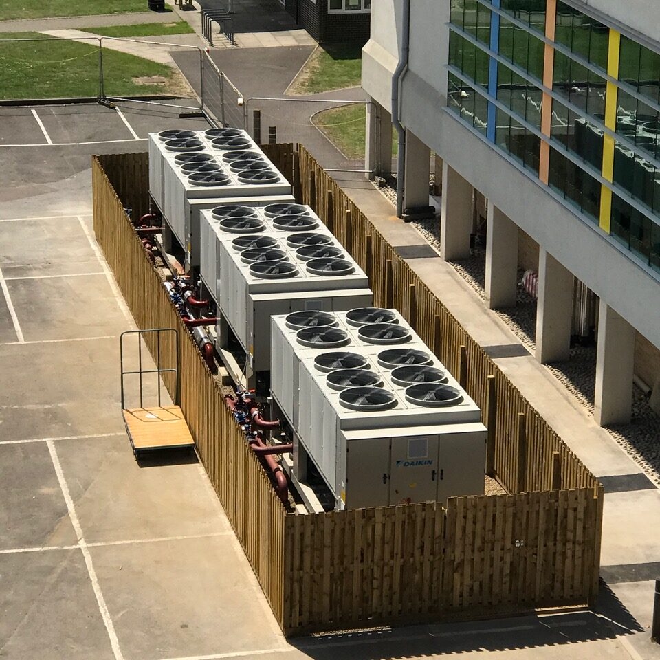 • Building Energy Management System upgrade. The existing system was obsolete and was replaced with a Trend IAQVision system which incorporates smart controls for the ASHPs, PV inverters and motors. Built-in software and connectivity provides constant real-time monitoring of energy use, speed, torque and temperature which allows automatic diagnosis of HVAC system issues.